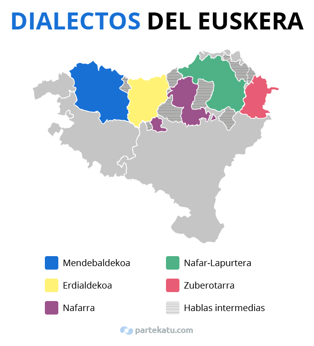 Jak widzimy na powyższej mapie, język baskijski to kontinuum językowe pięciu różnych głównych form dialektalnych oraz różnorodnych między nimi mieszanek i wariantów. Istnieje jednak wersja standard, zwana Batua (Zjednoczony), którą mniej, lub bardziej, posługuje się większość Basków.